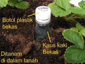 Kalau metode saya Botol di pasang sembu bagian penutupnya kemudian di letakkan sekitar 5 cm ke dlm tanah