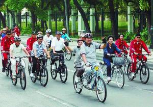 Presiden yang bersepeda tandem bersama Ibu Negara Ny Ani Yudhoyono datang sekitar pukul 06.40. Peserta Bike to Work baru datang pukul 07.10. Meski terlambat, Presiden tetap bersukacita menyambut mereka.
