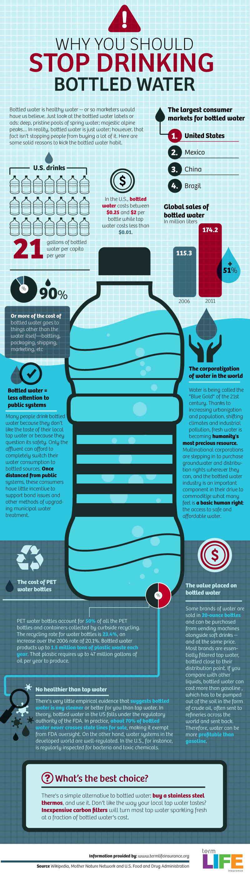 Grafik informasi berikut ini juga menarik. Salah satu informasi yang menarik untuk disimak adalah lebih dari 90% biaya dari harga yang kita beli adalah untuk botol plastik, biaya marketing, distribusi, dll yang mana diluar bahan baku air itu sendiri. Jadi, kenapa harus beli air dalam kemasan botol plastik? pakai saja botol sendiri yang bisa dipakai berulang-kali, apakah itu plastik atau berbahan aluminium.