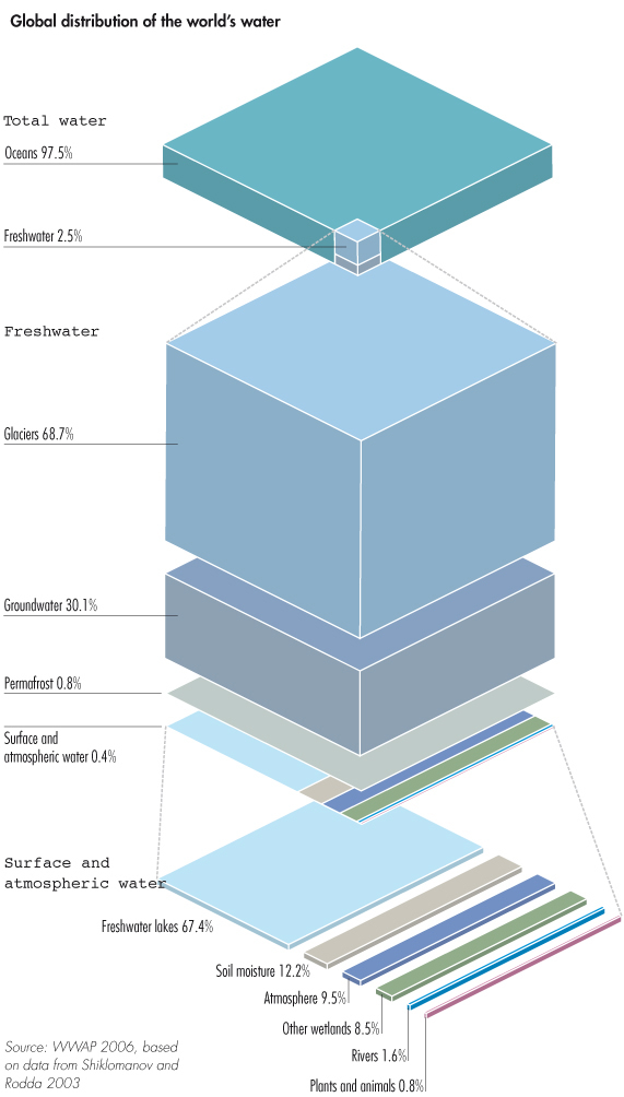 Grafik informasi ini menggambarkan secara detail berapa banyak air tawar yang kita miliki dan yang ada di atmosfer kita yaitu air hujan.